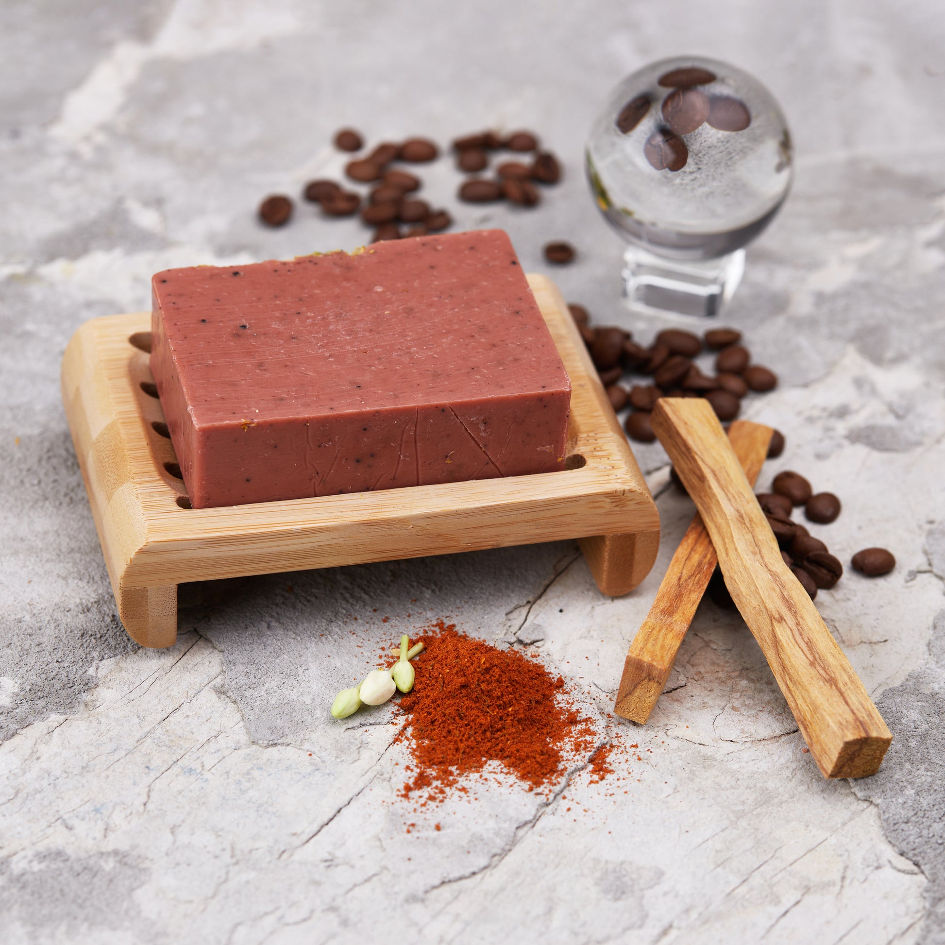 Ingredients: Saponified organic olive oil, organic coconut oil, organic flaxseed oil, organic shea butter, essential oils of sandalwood, myrrh, frankincense, orange, red clay, dragons blood powder, organic coffee grounds, red iron oxide, organic jasmine buds.