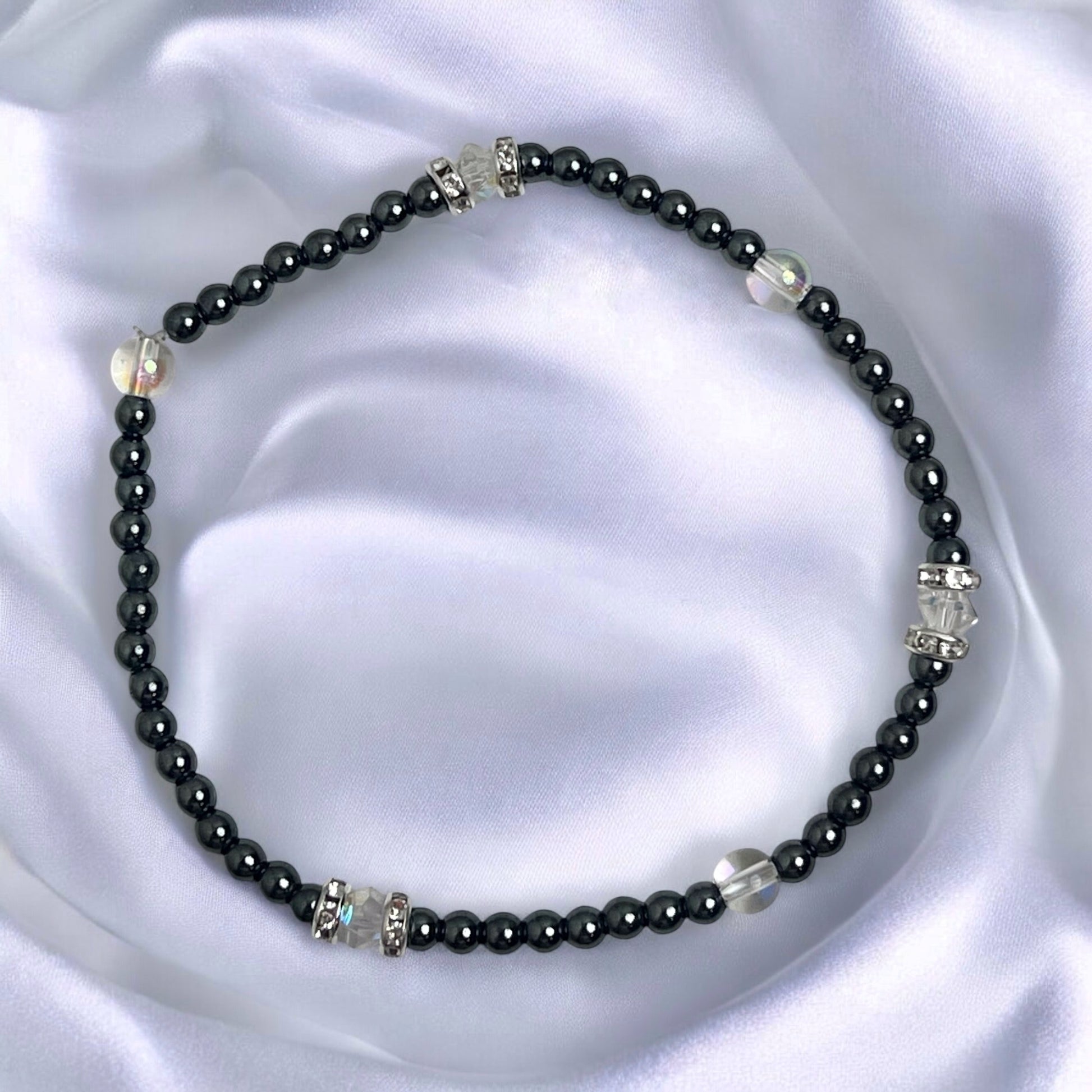 The Hematite gray anklet features polished hematite beads that are reflective with a metallic sheen. Accented with silver-plated rondelle spacers for a touch of sophistication. Hematite is a stone often used to harmonize the mind, body and spirit. It's also said to enhance willpower, courage and the ability to overcome challenges. The perfect accessory for daily wear or as a statement of intention. An ideal gift or a treasured addition to your personal collection.