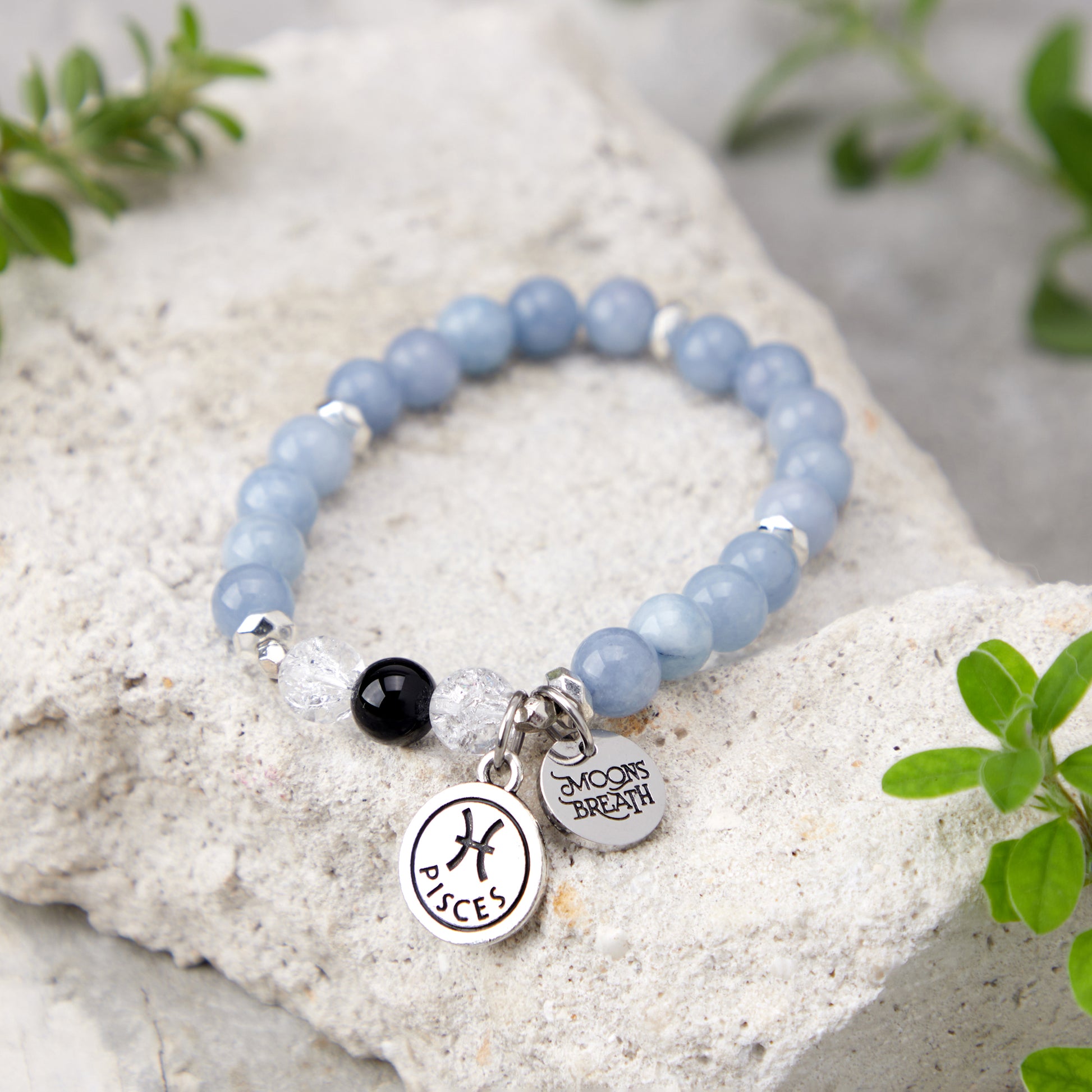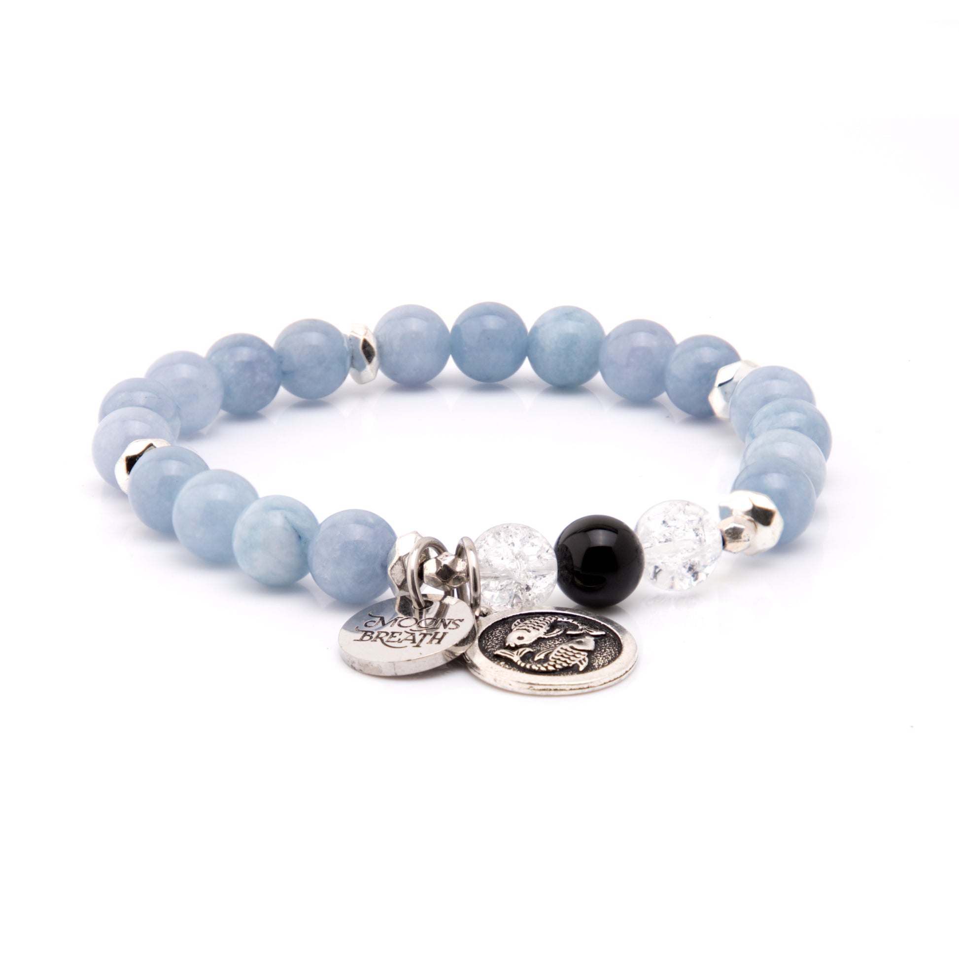 Details: Aquamarine, Crystal Crackle, Onyx, Pisces zodiac charm, logo charm, 8mm genuine gemstone beads. Strung on durable stretch cord to fit a variety of wrist sizes. Comes with a description card and signature gift box. Made in USA