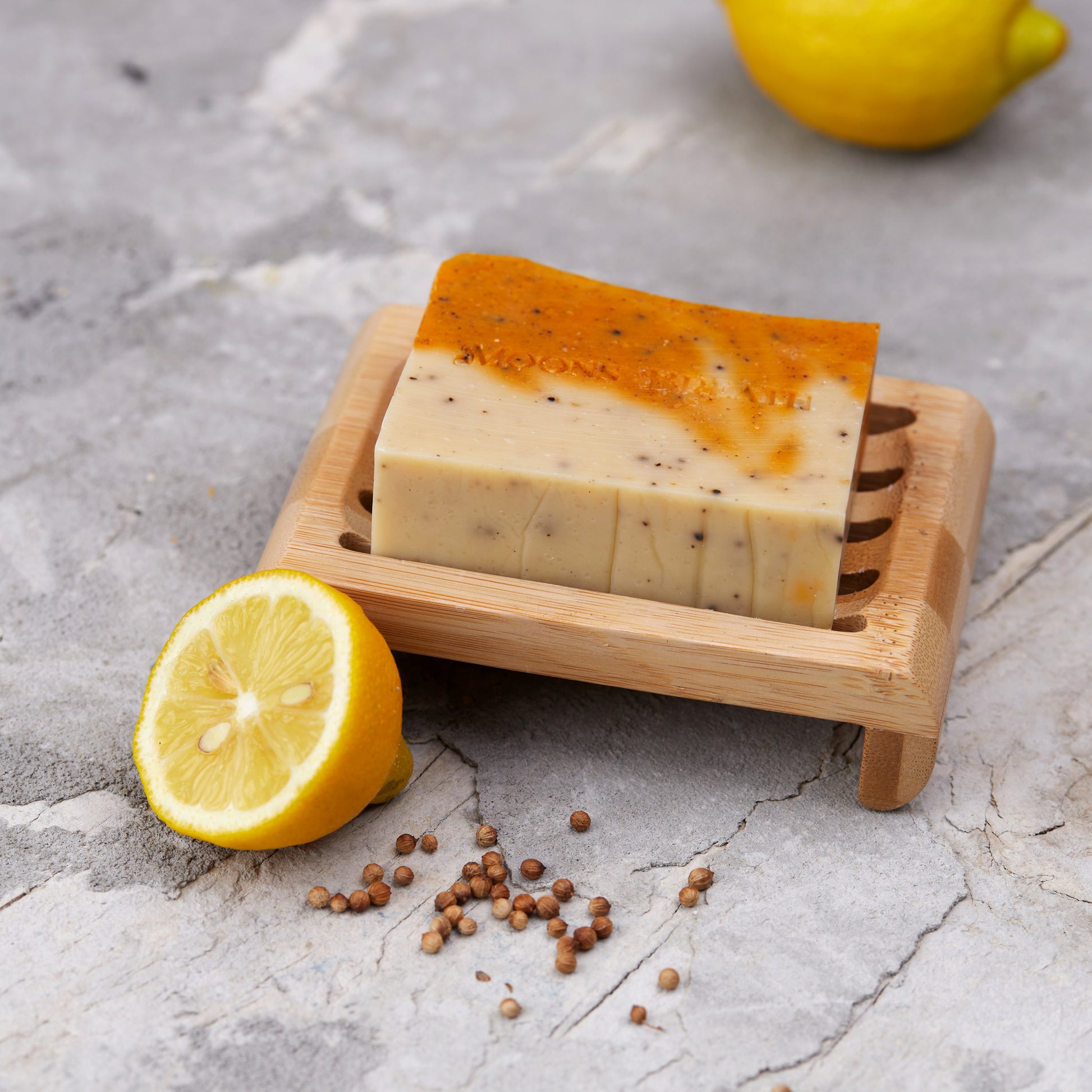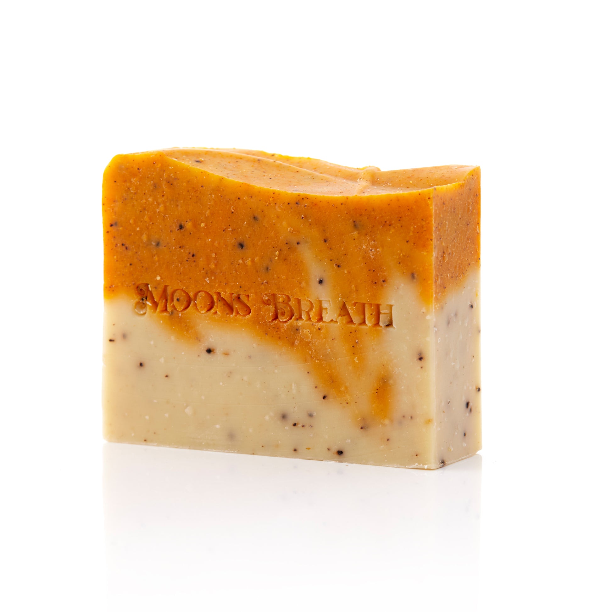 Ingredients: Saponified organic olive oil, organic coconut oil, organic flaxseed oil, goats milk, essential oils of orange, coriander, lemon, ground coffee, annatto powder.