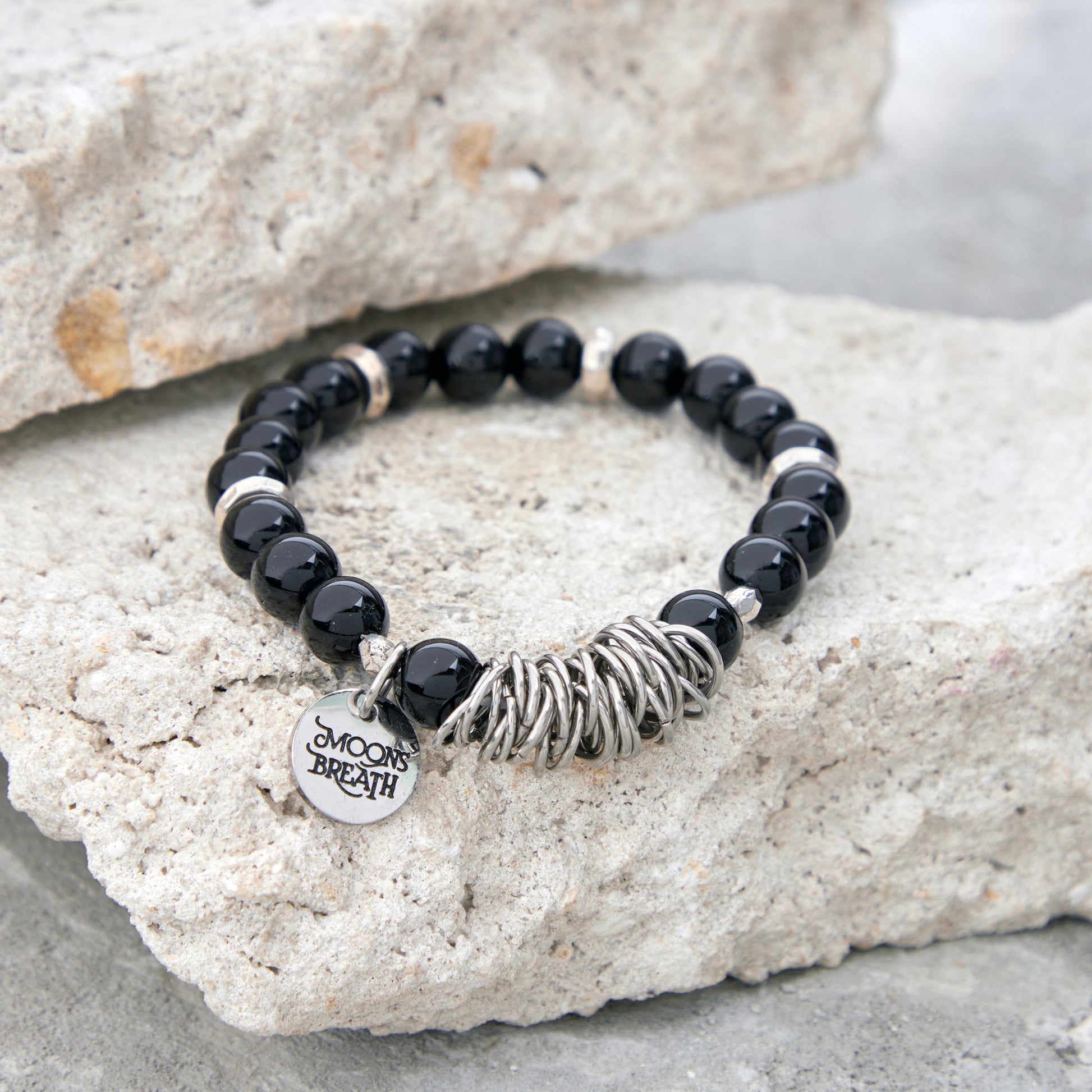 Details: Onyx, silver rings, logo charm, 8mm genuine gemstone beads. Strung on durable stretch cord to fit a variety of wrist sizes. Comes in a signature gift box.