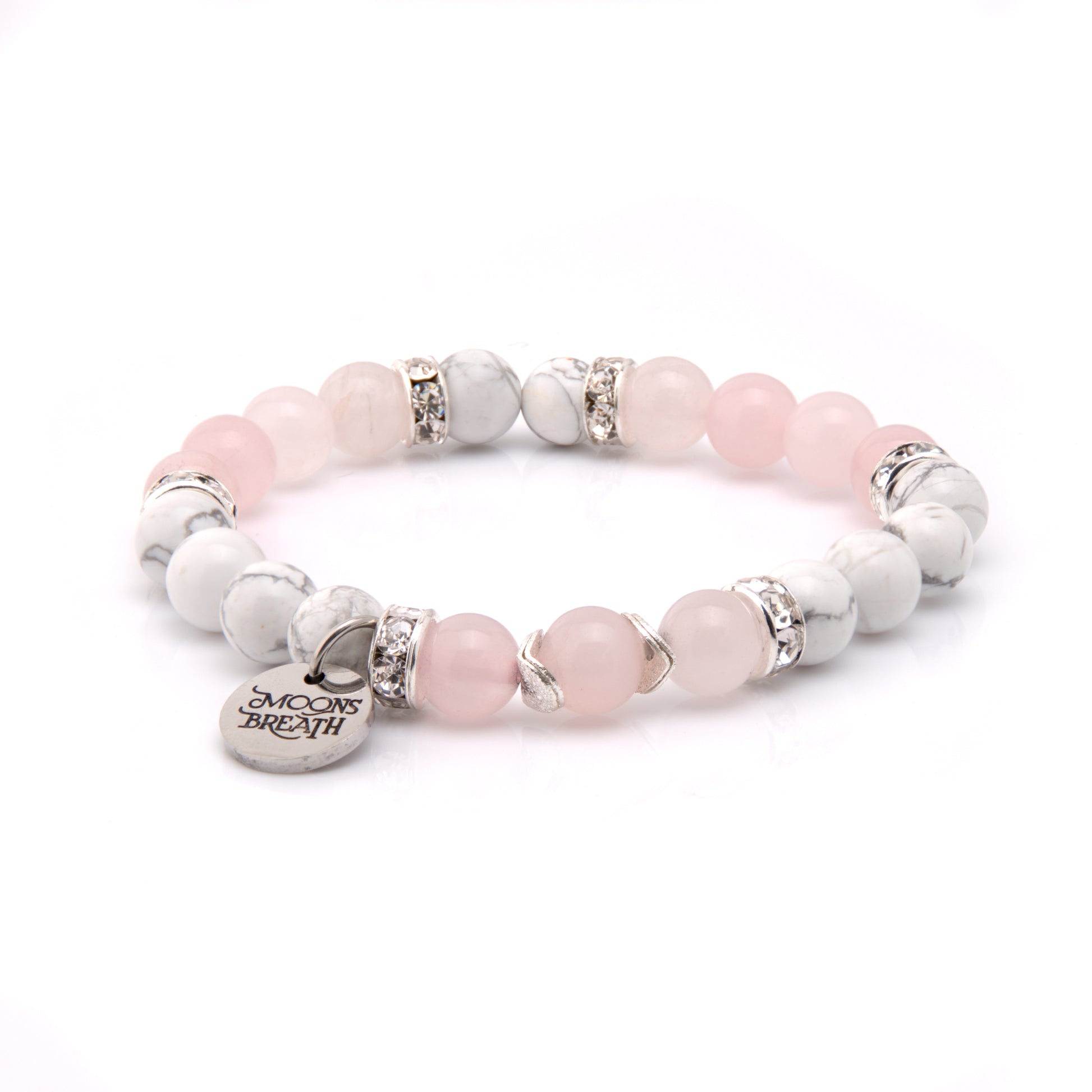 This elegant and feminine bracelet is beautifully crafted from two beautiful gemstones: Rose Quartz and White Howlite. Perfect for anyone seeking emotional healing and growth. Rose Quartz is mostly known for its connection to the heart chakra. A stone of love that opens the heart to all forms of love, including self-love, which is incredibly important. The White Howlite is known for its calming properties said to help to slow down your mind and body making it the perfect stone for meditation or relaxation.