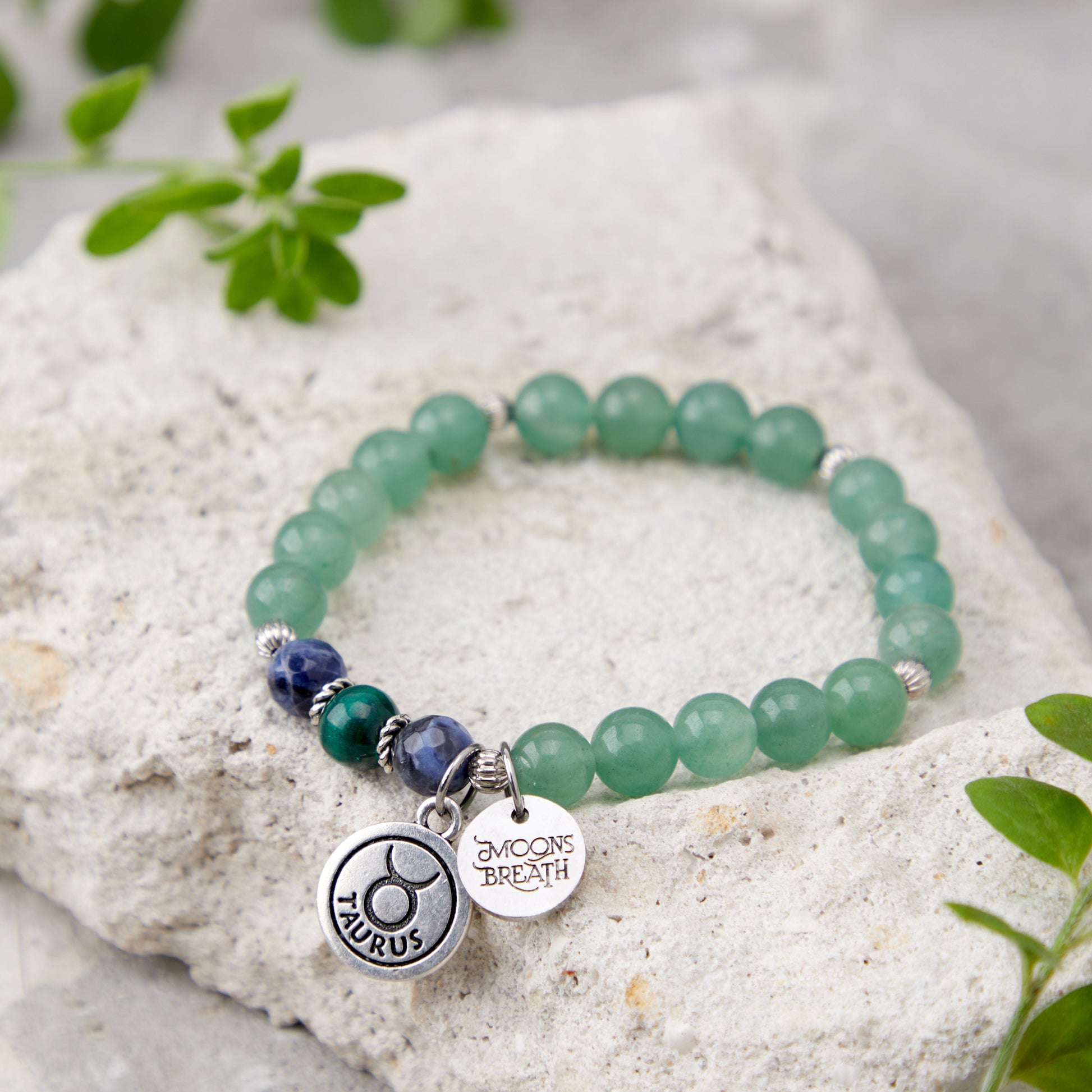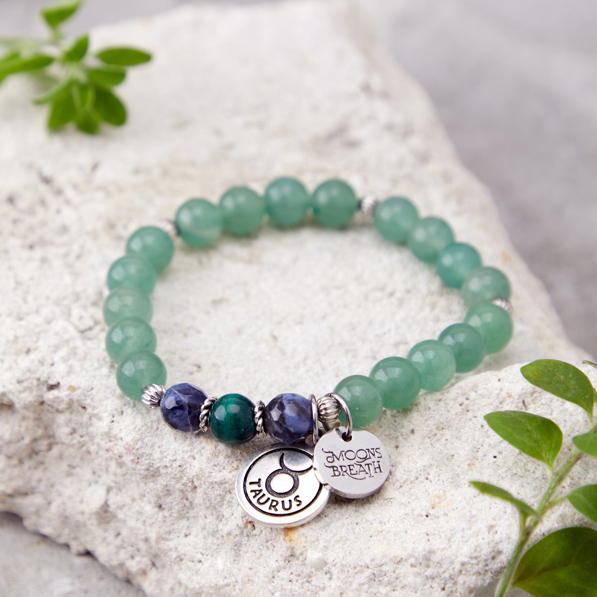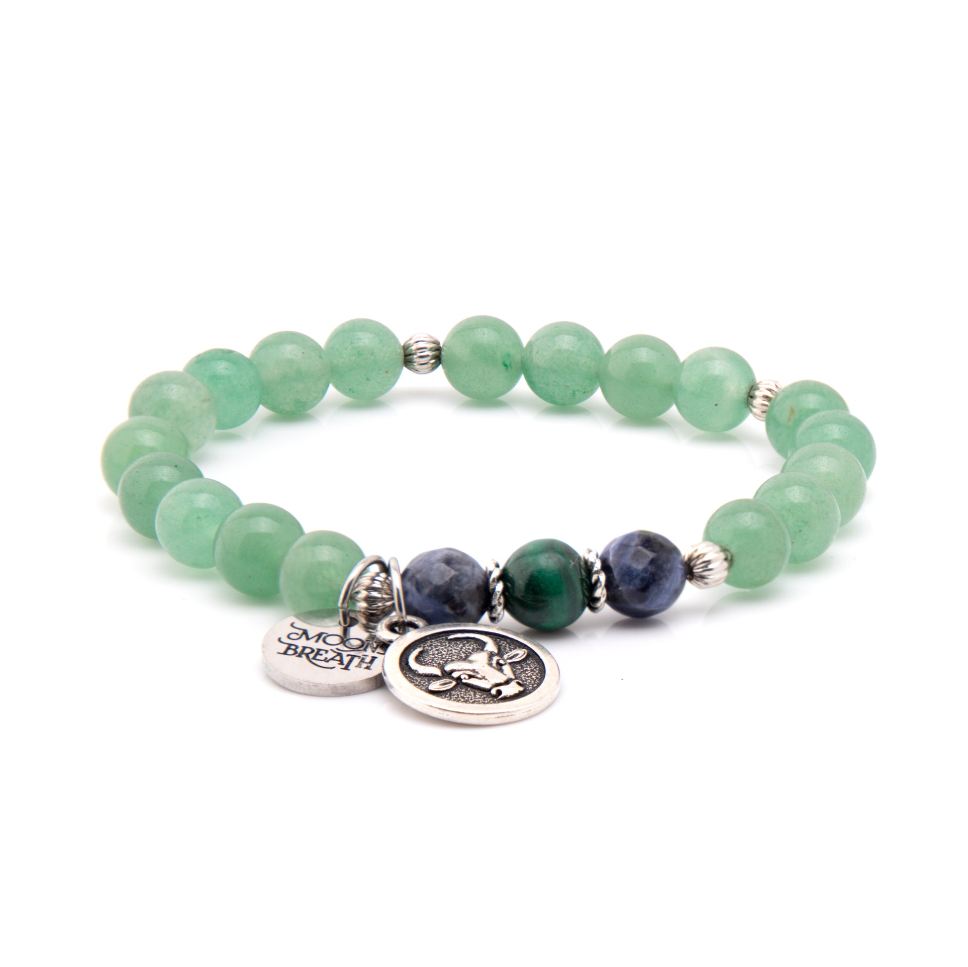 Details: Aventurine, Sodalite, Malachite, Taurus zodiac charm, logo charm, 8mm genuine gemstone beads. Strung on durable stretch cord to fit a variety of wrist sizes. Comes with a description card and signature gift box.