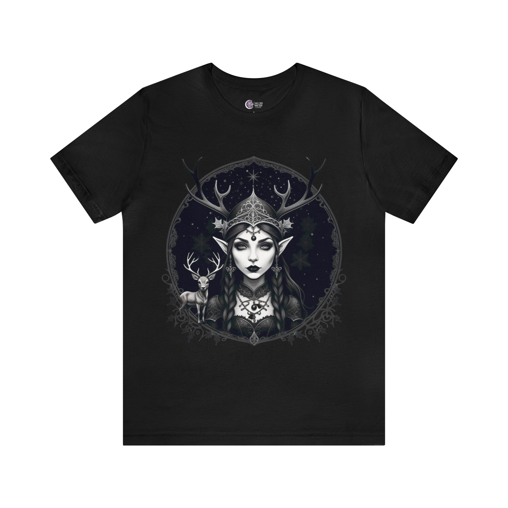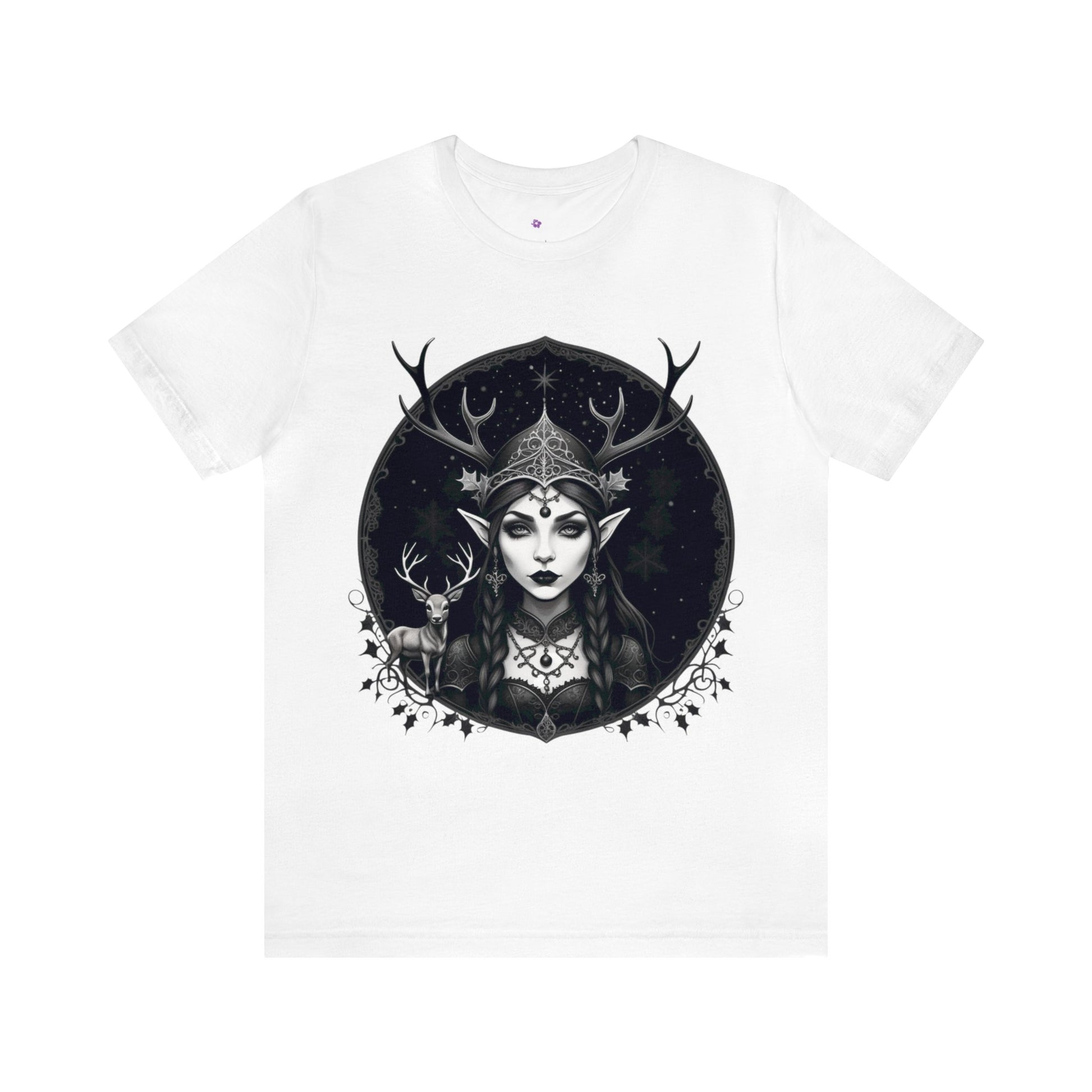 Introducing our enchanting Woodland Elf Queen t-shirt - a tribute to the magic and mystique of the forest, where the ethereal meets the earthly. Her presence exudes an air of tranquility and grace, while her eyes hold the wisdom of the ancient woods.